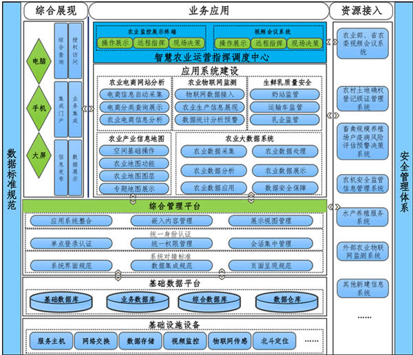 智慧农业中心建设总体目标是通过利用现代信息化技术手段,整体规划、设计智慧农业中心综合平台,以农业大数据构建、开发和应用为重点,强化信息集成,开发应用系统,配置硬件设施,形成“1+N”(一中心、多应用)的农业管理服务信息化平台和多层次的数据和系统开发应用,提升全市农业系统在农业资源管理、数据应用、指挥调度、监管监测、决策分析、行业管理等智慧应用水平,提升为农业生产经营服务的水平,为推进全市农业信息化建设起到示范、引领和推动的作用。